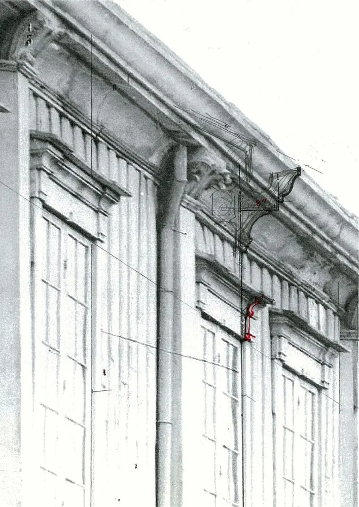 Tilbakeføringen av fasaden krever grundige studier av fotomateriale og originale deler for å hente frem igjen profiler på listverk, pilastre og andre dekorative elementer fra 1790-årene. Her vil vi forsøke å finne ut av hvordan de på slutten av 1700-tallet konstruerte en løsning ved raft med innebygd takrenne og saftige dekor-elementer. Vi vil også demonstrere hvordan vindusomrammingen sannsynligvis var bygd opp i en klassisk empirestil.